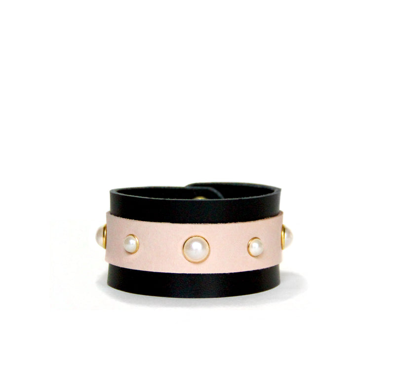 Double wrap leather bracelet with o-ring hardware and a small buckle closure.